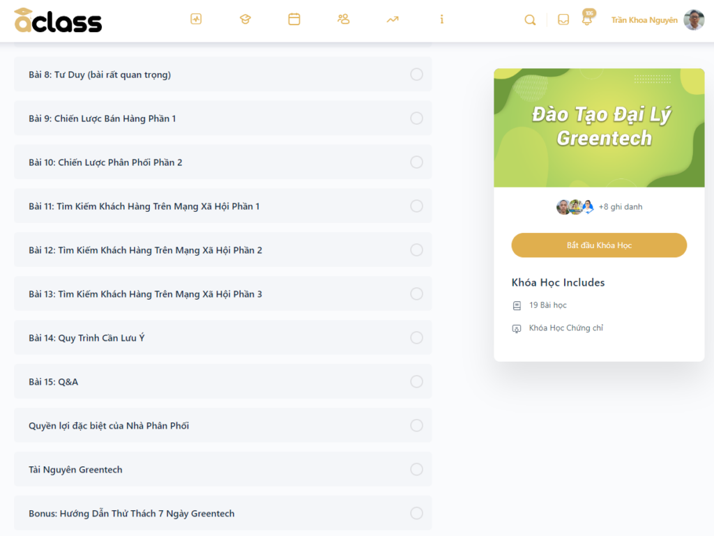 Có! Bạn sẽ được đào tạo về sản phẩm, quy trình cũng như cách thức tư vấn bán hàng thông qua nền tảng đào tạo Aclass tại liên kết: https://aclass.vn/courses/greentech/